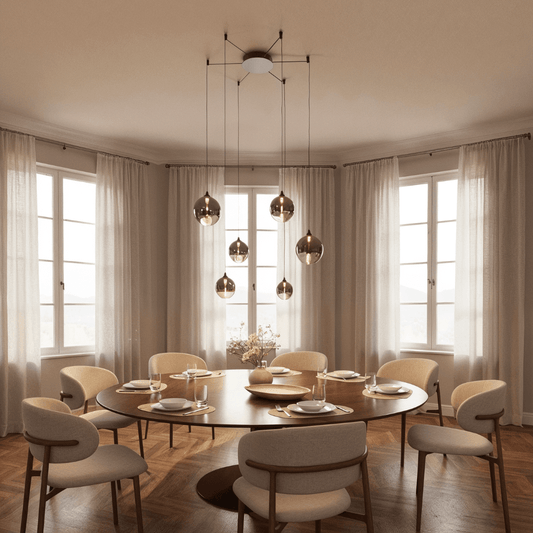 Die Größe der Lampe über dem Esszimmertisch hängt von der Tischgröße ab. Als Faustregel gilt: Die Leuchte sollte etwa zwei Drittel der Tischlänge betragen, um eine optimale Ausleuchtung zu gewährleisten. Für rechteckige Tische eignen sich vor allem längliche Leuchten, während für rundere Tischformen runde Leuchtenformen optimal passen. Bei ovalen Tischen sind beide Formen geeignet.