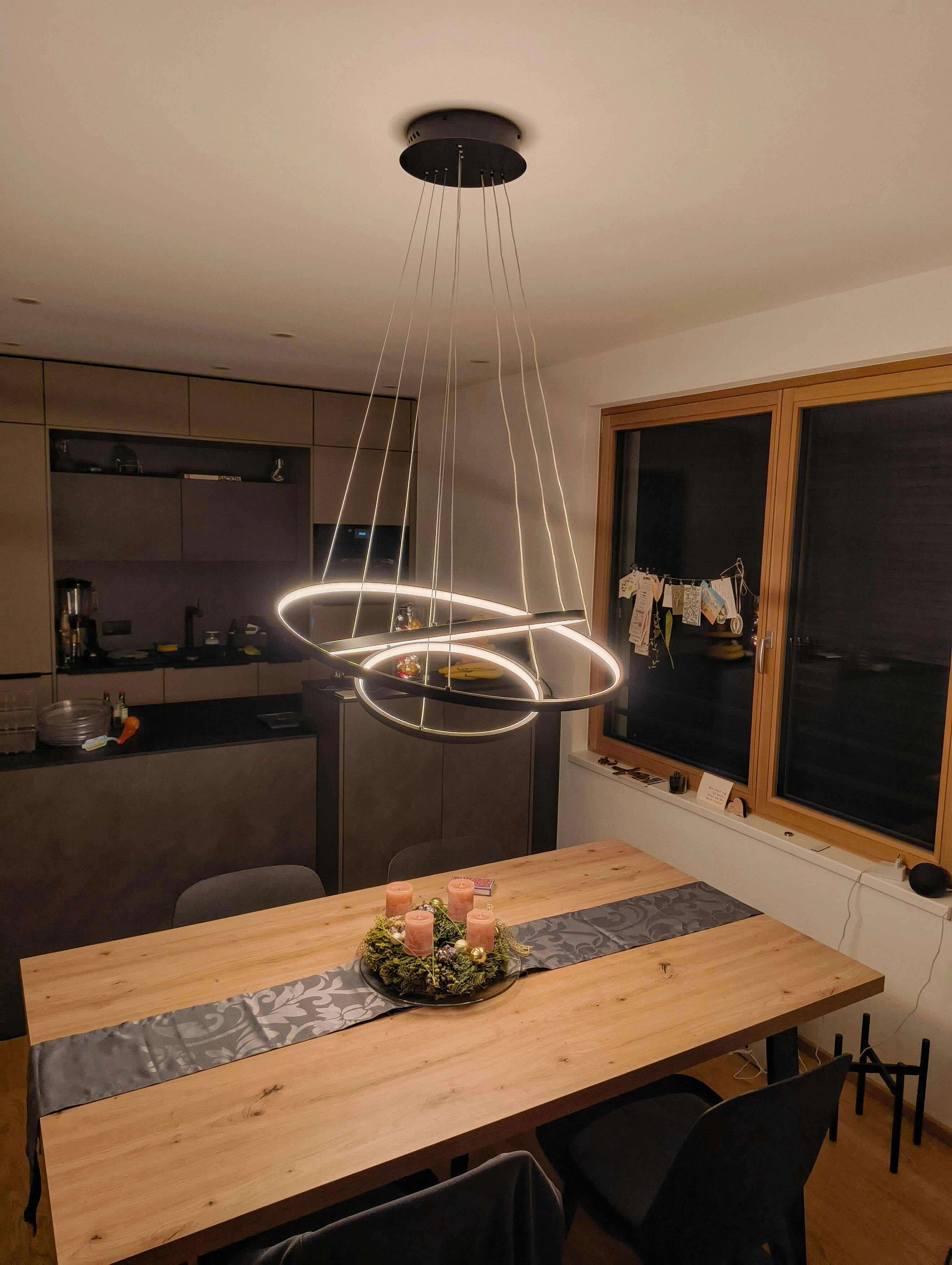 Die LED Hängeleuchte Esszimmer bringt mit ihrem besonderen Design immer ein besonderes Flair in dein Zuhause. Die klare Linienführung und die hochwertige Verarbeitung unterstreichen das moderne Design der Leuchte.